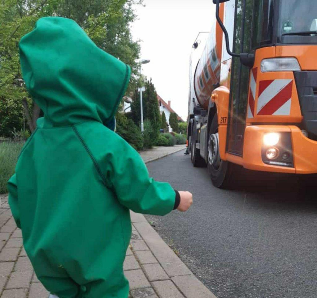 Nach einer gefühlten Ewigkeit näherte sich das dumpfe Grollen, dem er so sehnsüchtig entgegenfieberte. Das Müllauto! Weit weg war es nicht mehr und er blickte mit strahlenden Augen nach oben, um sicher zu gehen, dass auch sie dem Gefährt gebührend Aufmerksamkeit schenkte. Sie nickte ihm liebevoll zu und hielt seine Ungeduld an der Kapuze zurück. Sicher ist sicher…