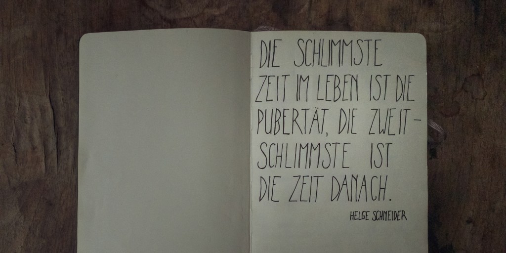 Ok, ich habe es nicht direkt verlernt. Es ist mehr so eine Vorsicht, die das schöne Notizbuch, das vorne ein Zitat von Helge Schneider und hinten einen Autogrammwidmungsgruß von Sarah Kuttner enthält, nicht mit meinem unsinnigen Gejammer verunstalten will. Dafür, also das Gejammer, wurde ja Social Media erfunden. Weil mir mein eigenes Gejammer aber selbst für Facebook und Twitter zu annoying scheint, packe ich das hier in diese winzige Ecke namens sadebeckPunktNet.