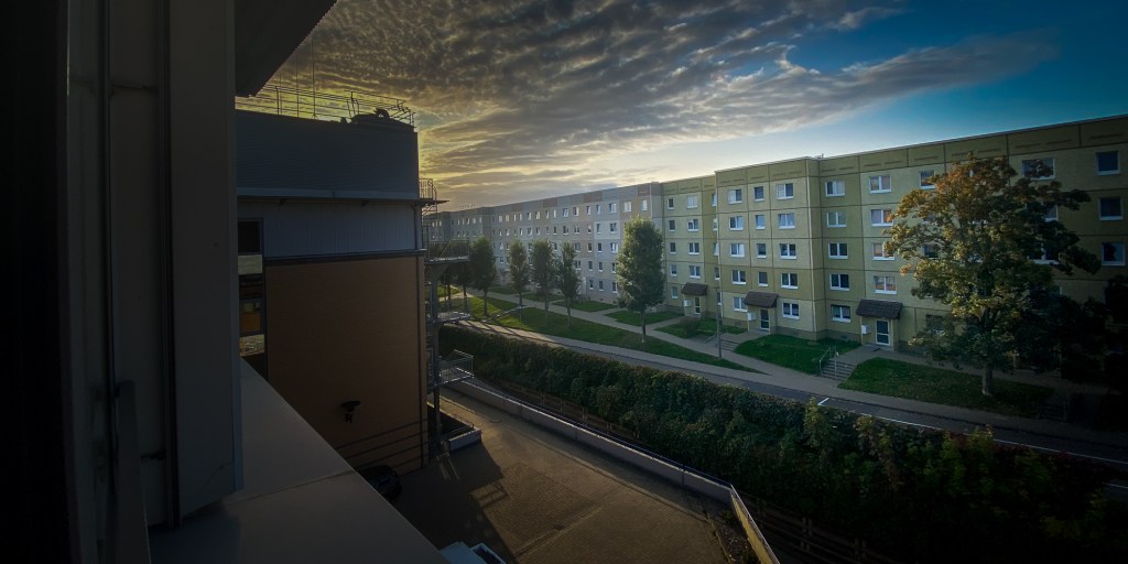 Ihr Blick fällt auf den gegenüber liegenden Plattenbau.
