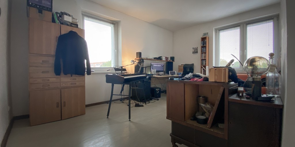Zentrum des „Wohn“zimmers: Schreibtisch mit Computer, E-Piano daneben und Lautsprecher-/Mikrofongedöns obendrauf. Hier entstehen die meisten BlockpostsTM und andere Kleinkunstmachwerke.