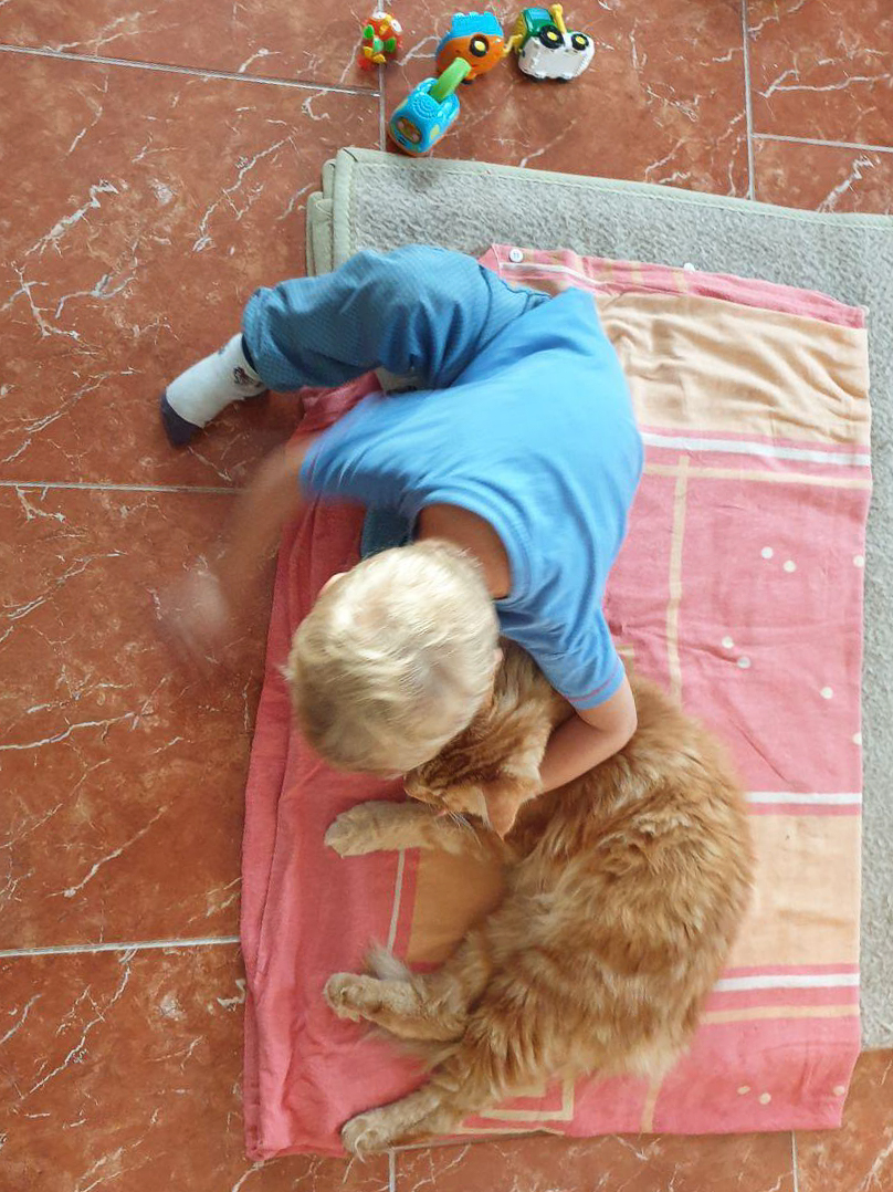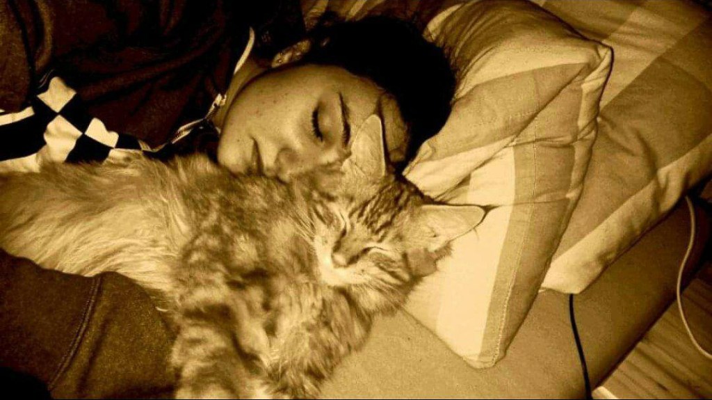 Er kommt abends nicht nach Hause. Sie sucht. Sie macht sich Sorgen. Sie ruft. Er antwortet. Sie folgt dem Miauen. Er hängt mit dem Halsband an einem Fahrradständer verklemmt fest. Sie befreit ihn und trägt ihn nach Hause. Er liegt die ganze Nacht an ihrem Kopf und schnurrt.