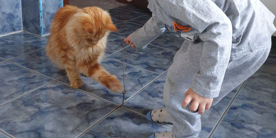 Zielgerichtet springt er höchst tödlich auf einen Maulwurf, der 2 cm unter der Erde unvorsichtig umhergräbt. Der schwarze Nager hat nicht den Hauch einer Chance. Er spielt vorsichtig und mit eingezogen Krallen mit dem Wirbelschlumpi, der ein Stück Faden in der Hand hat. Auch Knuddelattacken von oben herab lässt er über sich ergehen.