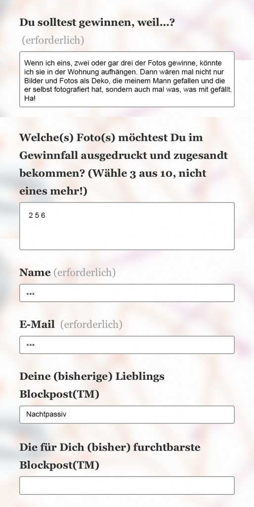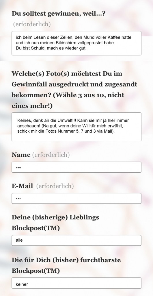 Mich freut natürlich sehr, dass einige meiner Bilder in Deine „Gefällt mir“-Kategorie zu fallen scheinen. Deshalb schreib mir einfach, wohin ich Deine Bilder senden darf und auch Dir… ähm…